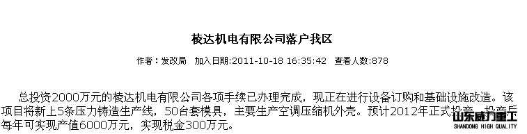 牡丹江棱達(dá)機(jī)電有限公司,該企業(yè)是浙江溫嶺立華機(jī)械公司投資2000萬元,利用老廠房改建而成,主要為富通空調(diào)機(jī)公司配套。目前項(xiàng)目已正式投產(chǎn),年可實(shí)現(xiàn)產(chǎn)值2000萬元,利稅150萬元。【市委書記張晶川深入東安區(qū)和西安區(qū)中小企業(yè)工業(yè)園區(qū)調(diào)研2012-9-6】